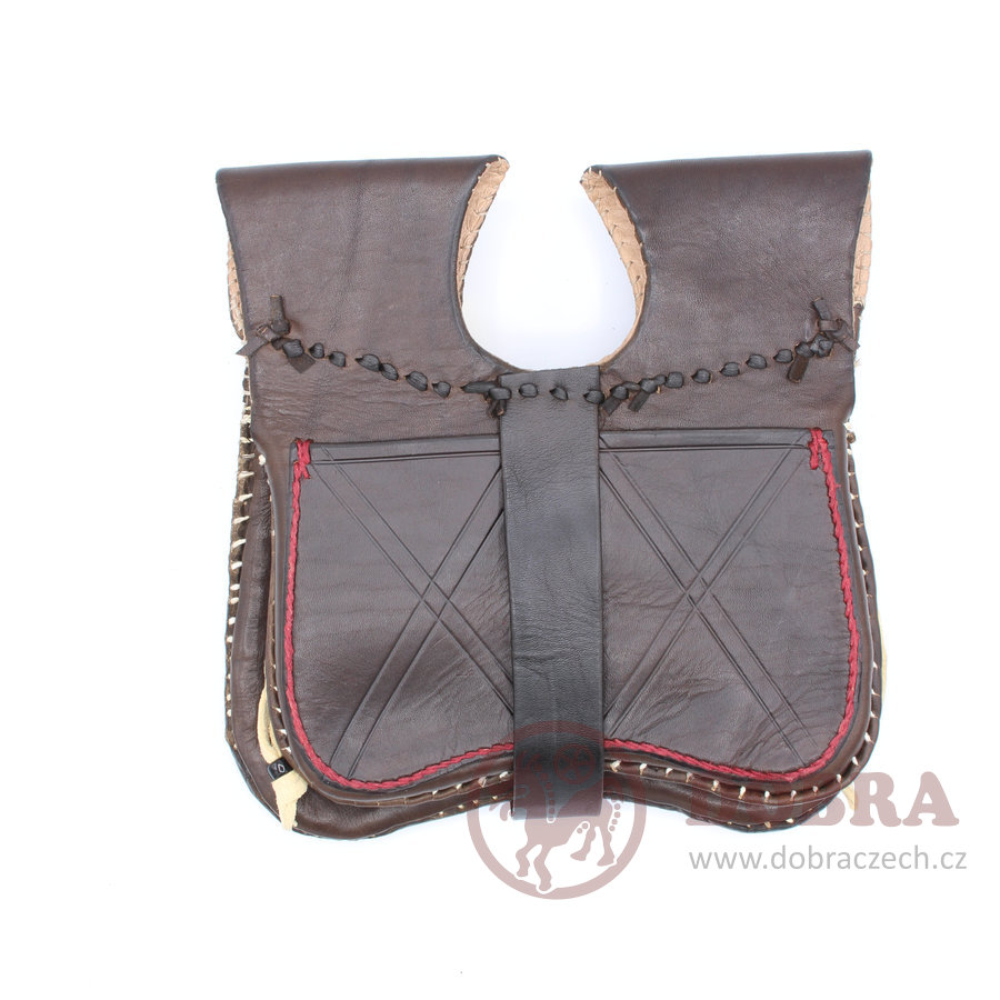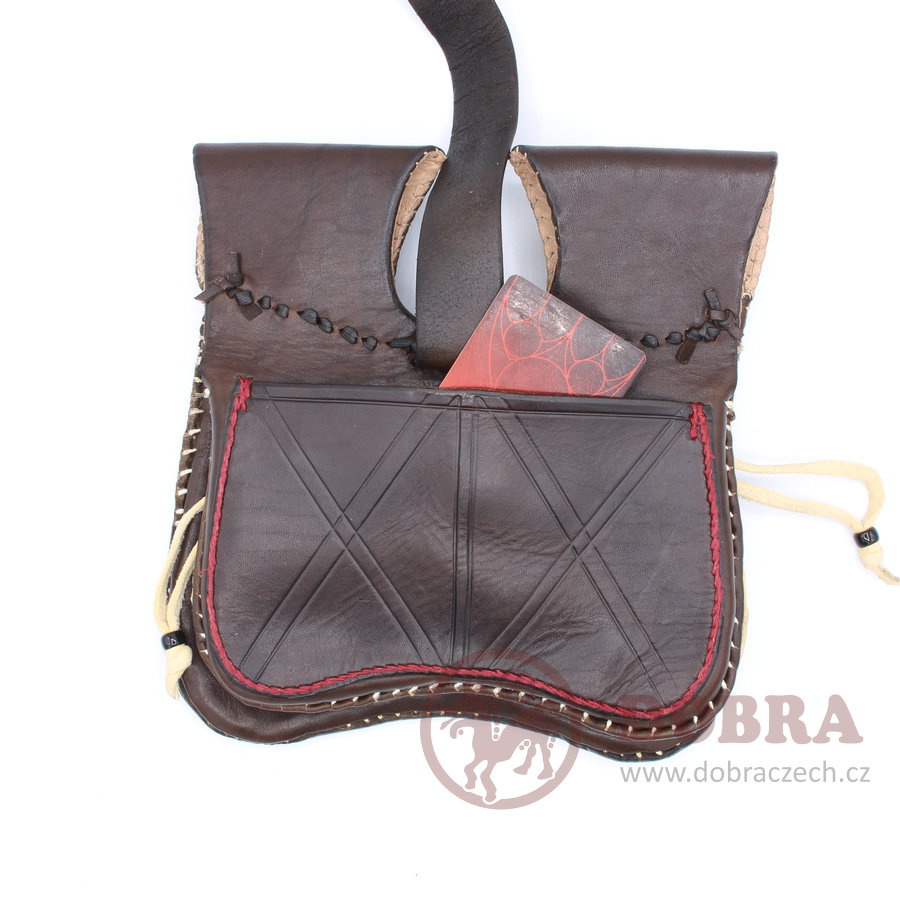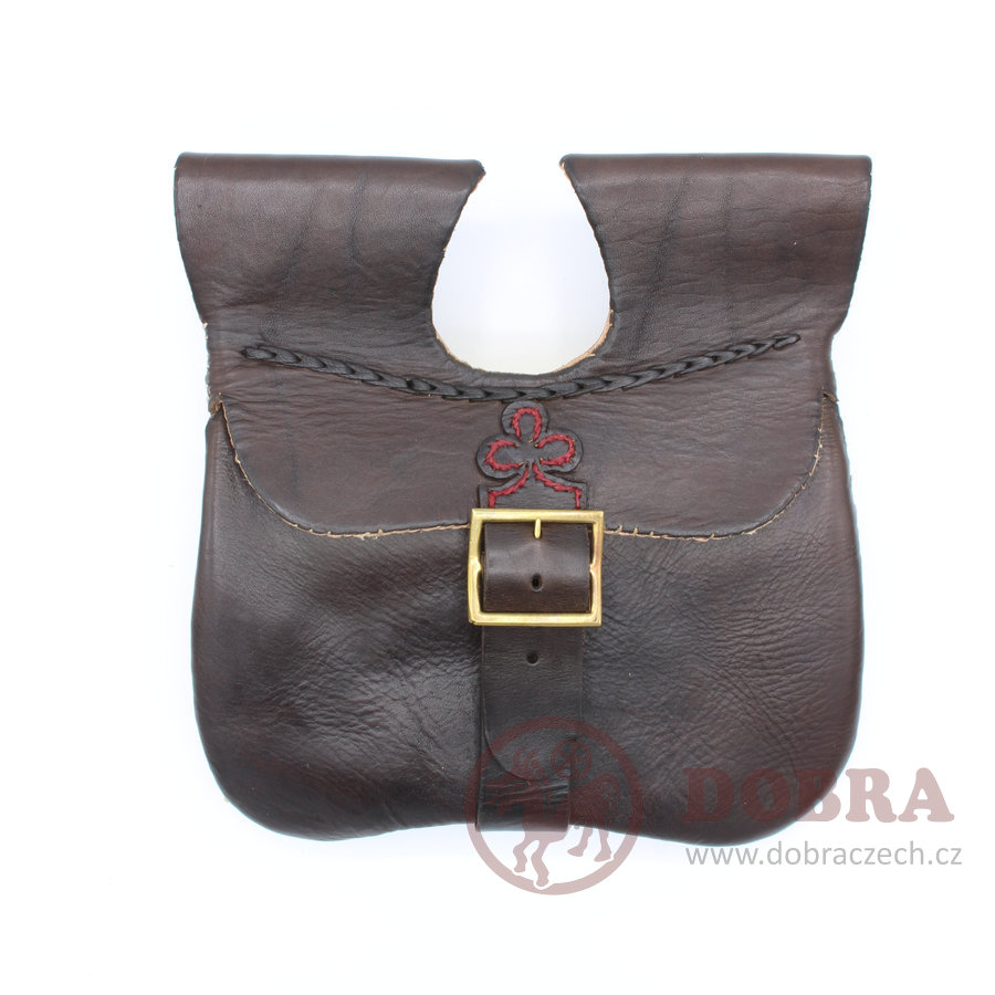 Středověká toboka podle nálezu z Dordrechtu (inv.č. 6801.216.002, (Obročníková, 2025)). Tento typ tobolek s klopnou a křidélky se vyskytuje od konce století 14. Do počátku 15. století je potom tato datována na základě vyšitého trojlístku který připevňuje zápinku ke klopně.