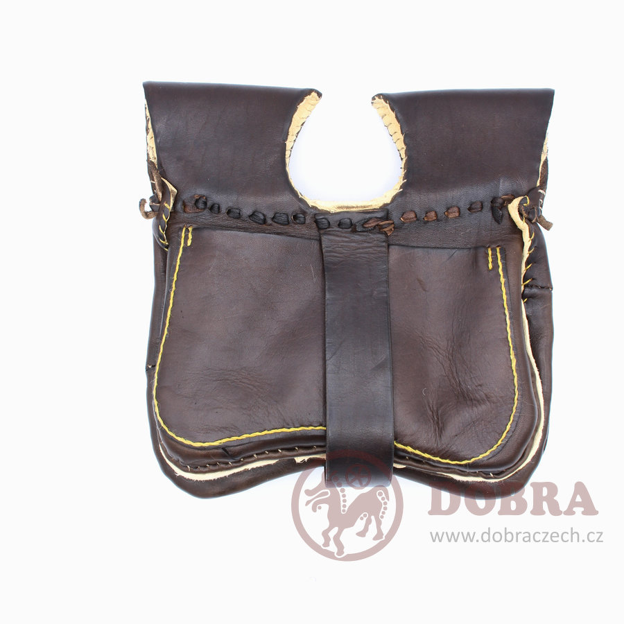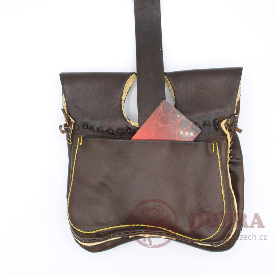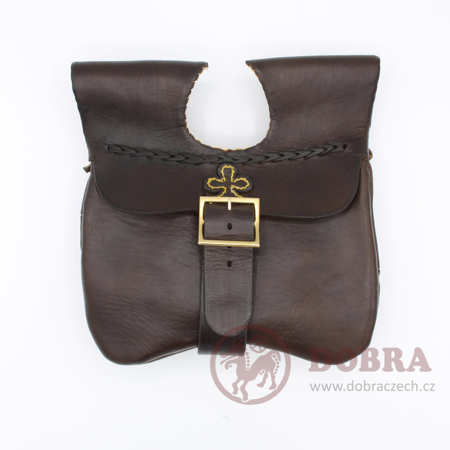 Středověká toboka podle nálezu z Dordrechtu (inv.č. 6801.216.002, (Obročníková, 2025)). Tento typ tobolek s klopnou a křidélky se vyskytuje od konce století 14. Do počátku 15. století je potom tato datována na základě vyšitého trojlístku který připevňuje zápinku ke klopně.