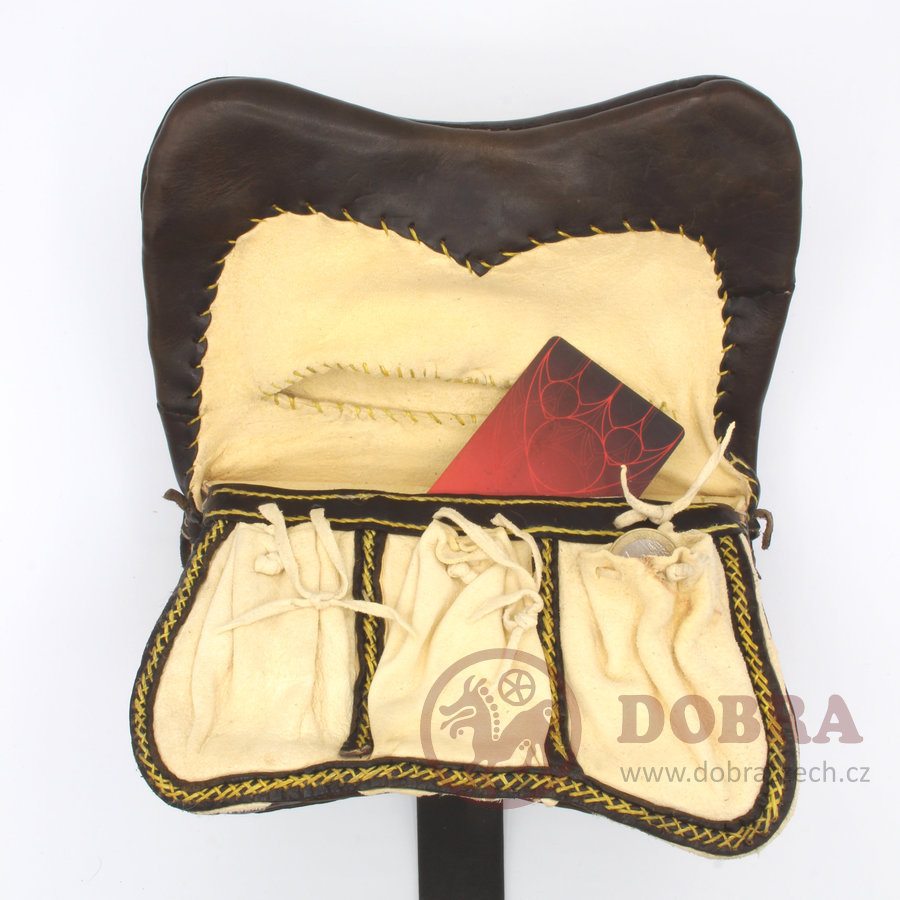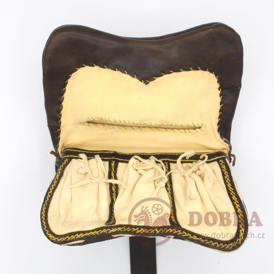 Tobolka má dvě hlavní kapsy, přístupné zevnitř tobolky, na přední straně zadní kapsy ještě tři přídavné váčky na stahovací šňůrky. Na zadní straně tobolky je tak jako na originálu přídavná plochá kapsa.